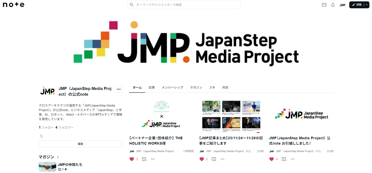 その活動を、『JMP(JapanStep Media Project) 公式note』で発信しています。本公式noteでは、MetaStepの本編では書けなかった取材舞台裏から、キーワード解説、パートナー企業・団体紹介、運営会社クロスアーキテクツの紹介など、様々なコンテンツを毎日更新してお届けしています。MetaStepとあわせ、是非アクセス&フォローしてみてください。
