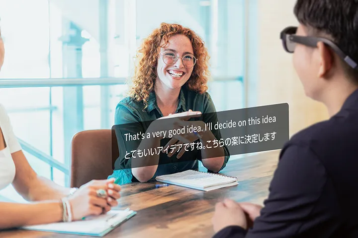 外国語を交えたコミュニケーションが円滑に。相手の話す内容をリアルタイムに翻訳し字幕を目の前に表示する。さらに風景の中にある外国語を自動認識し翻訳してくれる「ビジュアル翻訳」などのアプリケーションも利用可能だ。