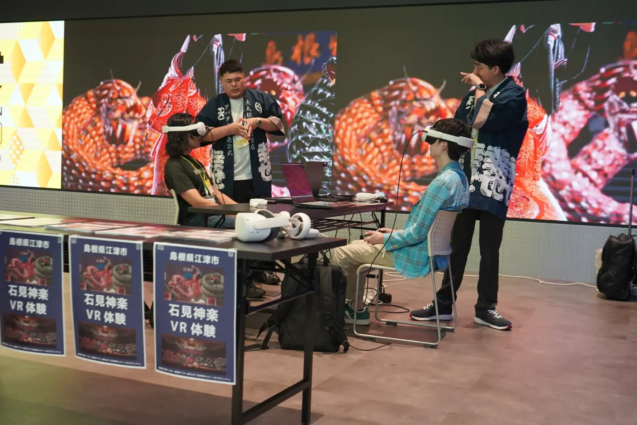 サミット会場では石見神楽の体験ブースも。登壇者の福澤氏(左奥)自ら魅力を伝えた