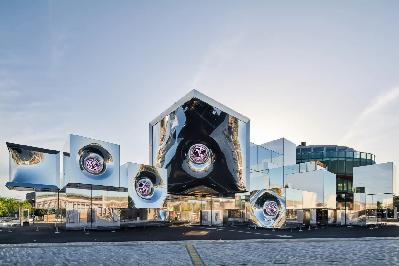 次に、「null²」には建築チームとしてのNOIZやARUP、太陽工業以外にも、動的機構やビジュアルの専門チームもかかわっている。「実物大ガンダムの制作経験を持つ乃村工藝社や、ロボット制御システムのアスラテック、ビジュアルプロダクションのWoWなど、映像や物を動かす最先端のチームが当初から集まっていました。鏡面膜の内部に多数のロボットアームやウーファーなど複数のアクチュエーターを設置し、これらが膜を物理的に操作することで、建物の表面がさまざまな動きで絶えず変形します」(豊田氏)