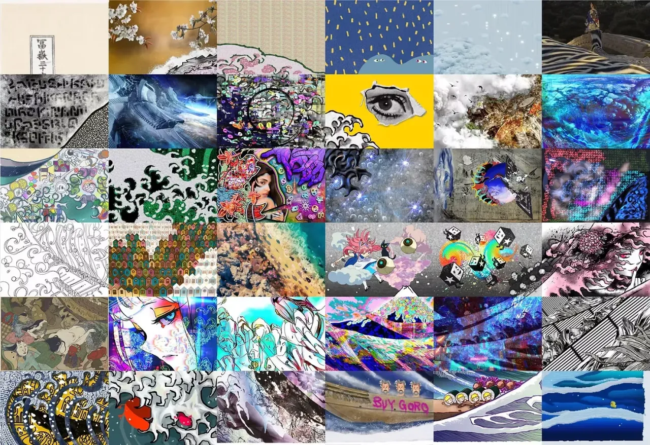 同年の夏には、クリプトアーティストのMERA氏とプロデューサーの高瀬氏が企画した「36FUJIプロジェクト」に挑戦しました。これは葛飾北斎の名作『神奈川沖浪裏』を36区画に分割し、それぞれの区画を36人のアーティストが描き直して再構築するという壮大なNFTコラボレーション企画でした。