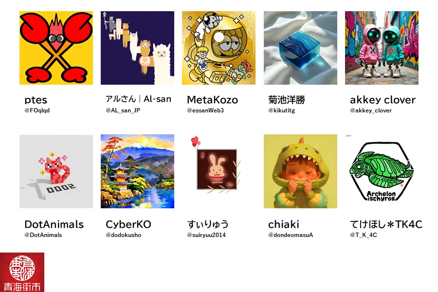 ここにデジタル住民権の公式ブースが登場しました。バーチャル青島の動画公開に加えて、注目すべき試みが実現しました。10名のクリエイター(ptes、DotAnimals、アルさん|Al-san、CyberKO、essan fam、すぃりゅう、菊池洋勝、chiaki、akkey_clover、てけほし*TK4C)によるNFTアートのミニ展示です。