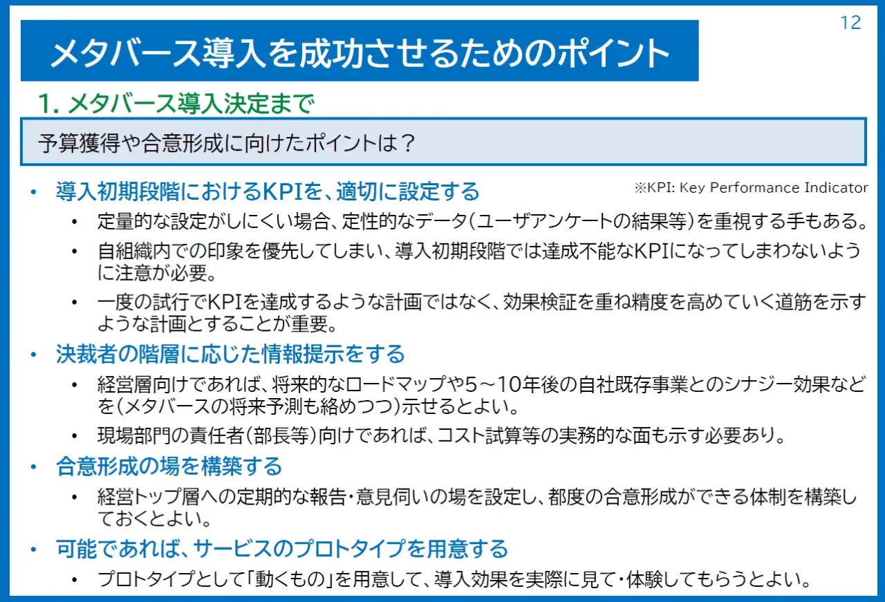 一つは、「社会課題の解決に向けたメタバース導入の手引き」の策定である。これはメタバースを活用した企業の成功事例を参考に、これから導入を検討する企業や自治体が失敗しないためのポイントをまとめたものだ。
