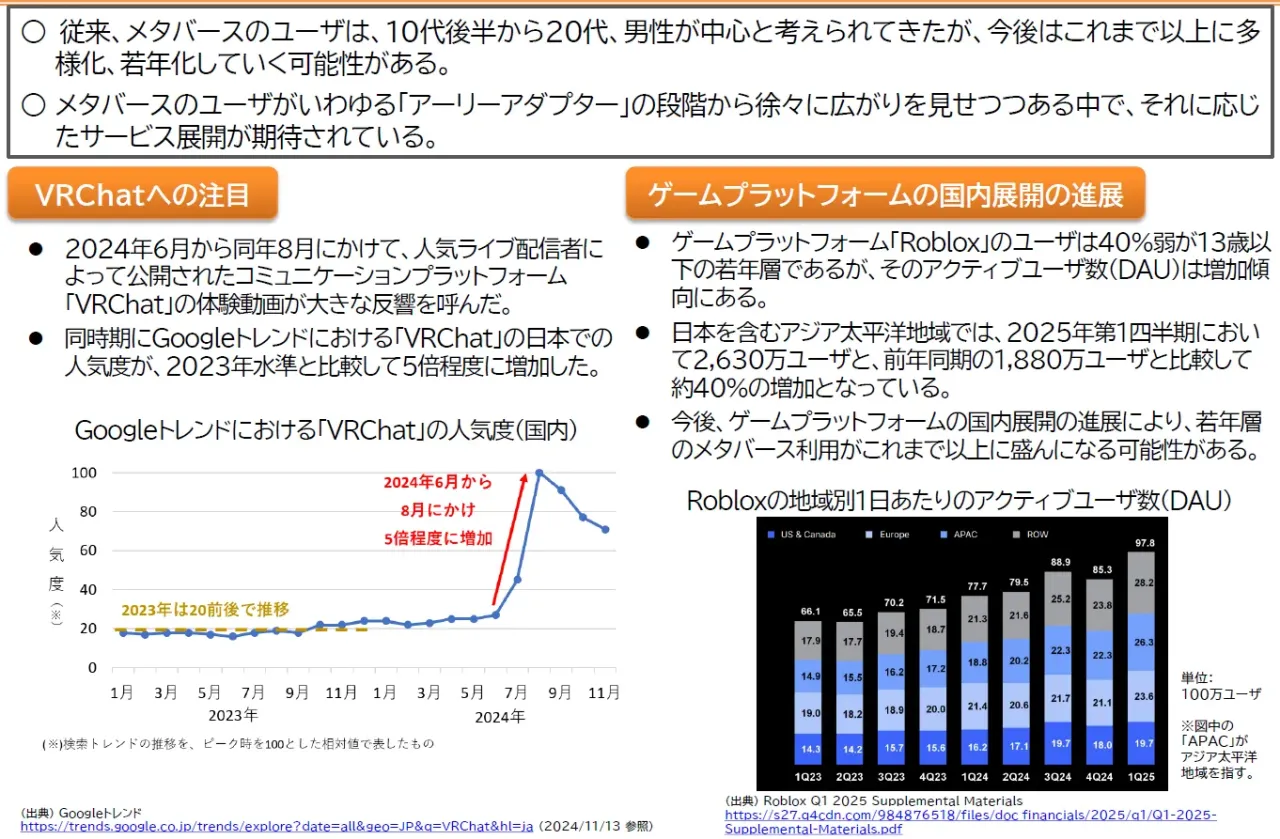 メタバースユーザーは個人利用を中心に増加かつ若年化している。配信者経由によるVRChatユーザーの増加や、ゲームプラットフォームの拡大が主な要因と考えらえる
