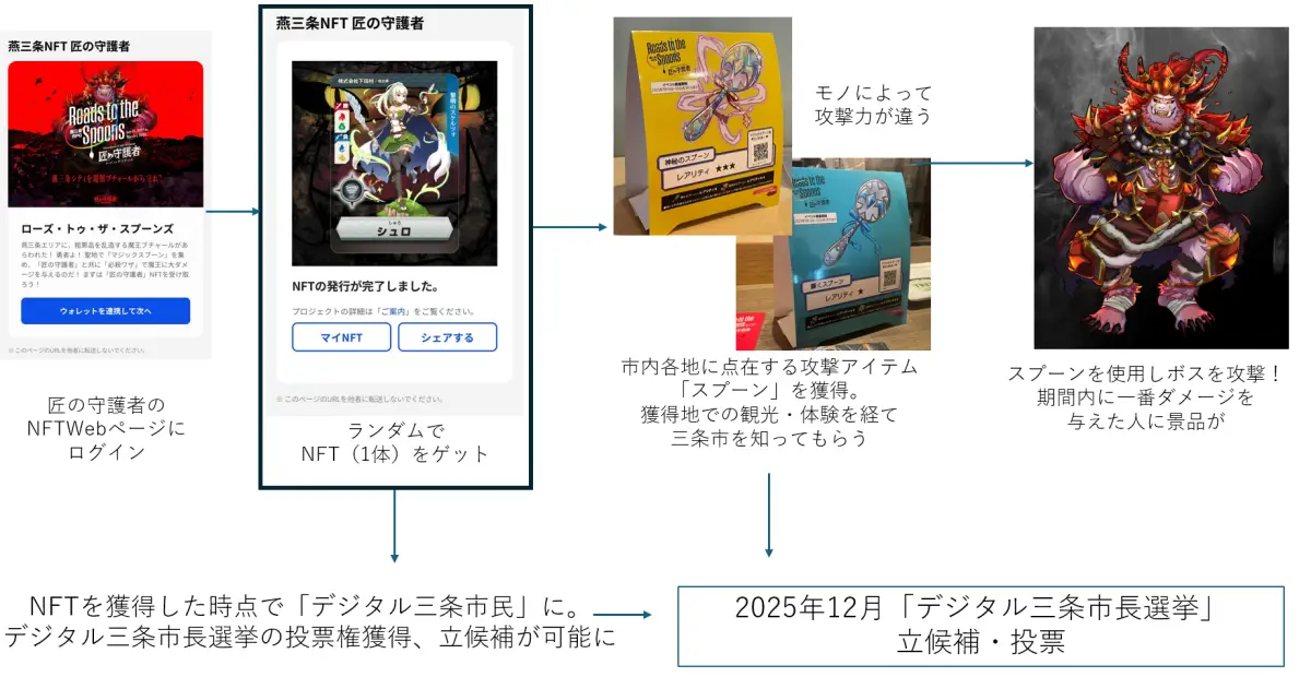 デジタル三条市民証NFTの取得を加速させるため、三条市は当プロジェクトと連携。キャラクターたちをNFT化し、燕三条エリアの企業や店舗を回遊するイベント「燕三条RPG匠の守護者 ーローズ・トゥ・ザ・スプーンズー 」を実施した。燕三条エリアの各所約50カ所にあるQRコードを読み取り、攻撃アイテム「マジックスプーン」をゲットし、ボスキャラに攻撃する。金属加工のまちならではのアイテムだ。期間内で最もダメージを与えたプレイヤーには豪華景品が授与される。