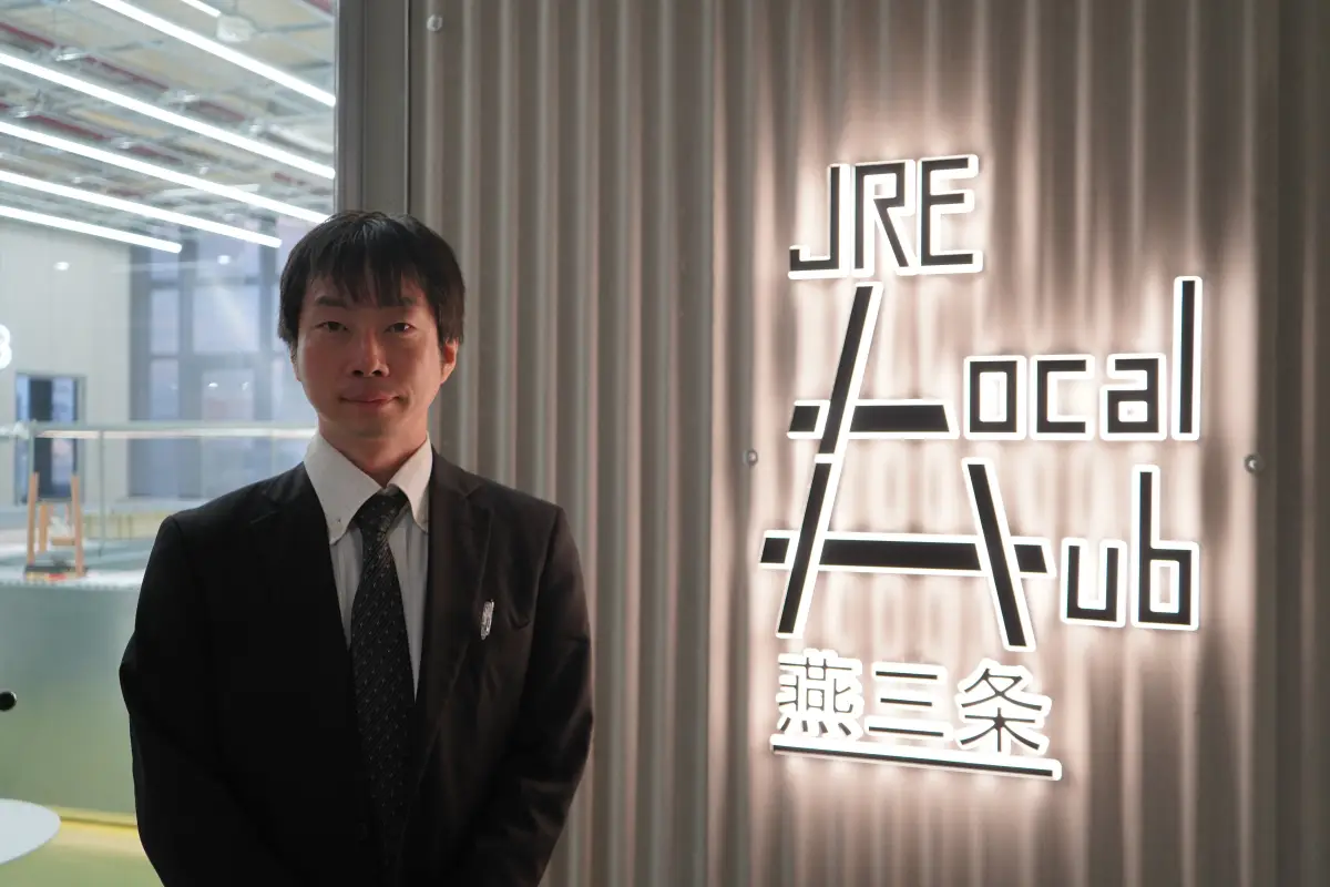 三条市 市民部 地域経営課 中心市街地活性化推進係 係長 中村 健太さん。燕三条駅内にあるワーキングプレイス「JRE Local Hub」ではものづくりコンシェルジュが常駐し、燕三条の技術者と商品開発担当者をつないでいる