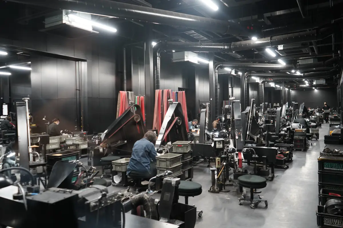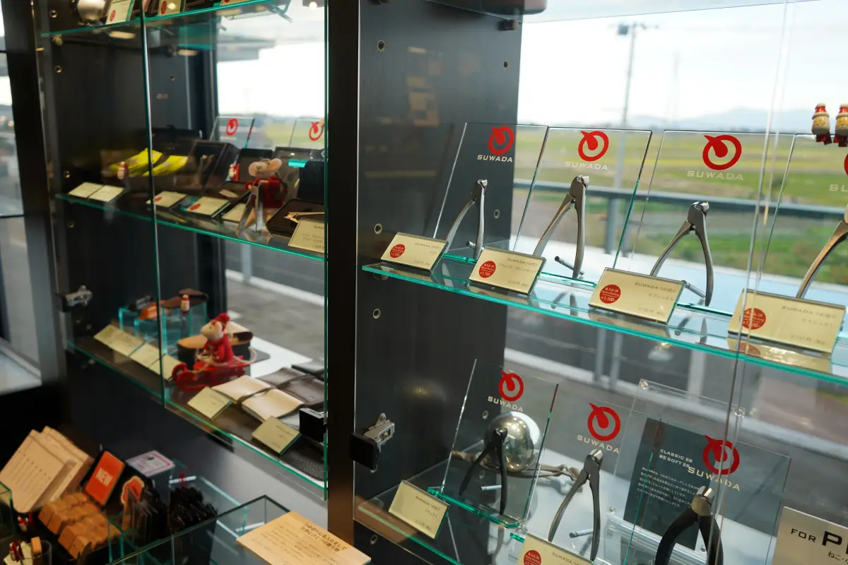 工場建屋やショップを一体化した「SUWADA OPEN FACTORY」は、鋼材が製品になるまでのプロセスをガラス越しに公開することで、職人技を体験価値へ転換し、ブランドストーリーを視覚的に訴求する場となっている。職人の手つきを間近で見るために県内外、時には外国から訪れる人もいるという。