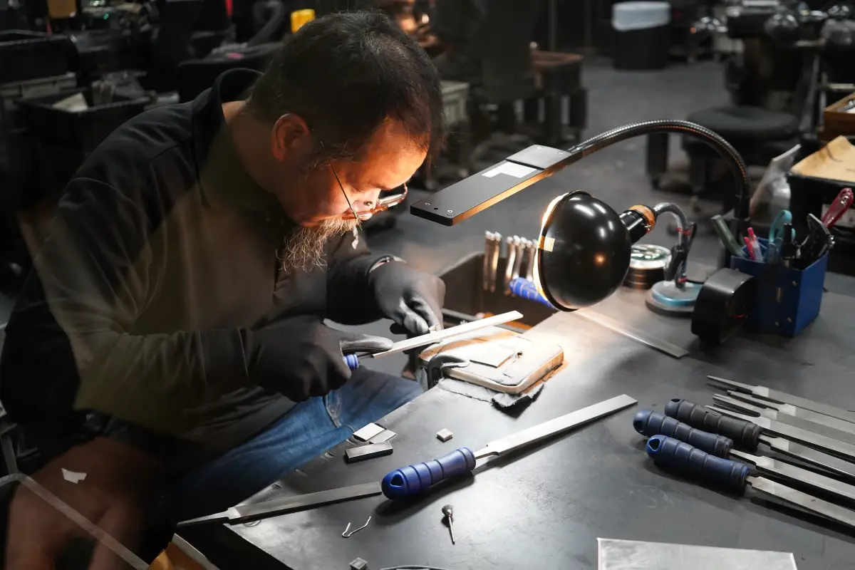 工場建屋やショップを一体化した「SUWADA OPEN FACTORY」は、鋼材が製品になるまでのプロセスをガラス越しに公開することで、職人技を体験価値へ転換し、ブランドストーリーを視覚的に訴求する場となっている。職人の手つきを間近で見るために県内外、時には外国から訪れる人もいるという。