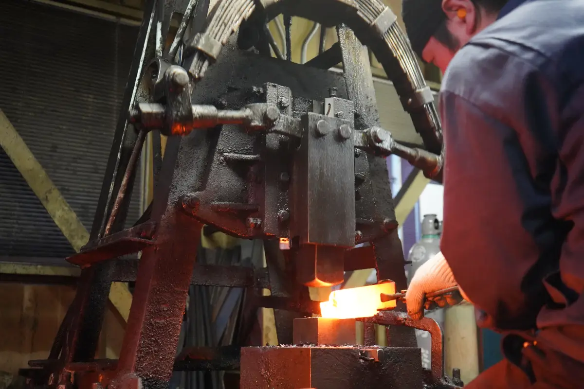 超高温に熱された鉄を、機械でプレスし成型する様子