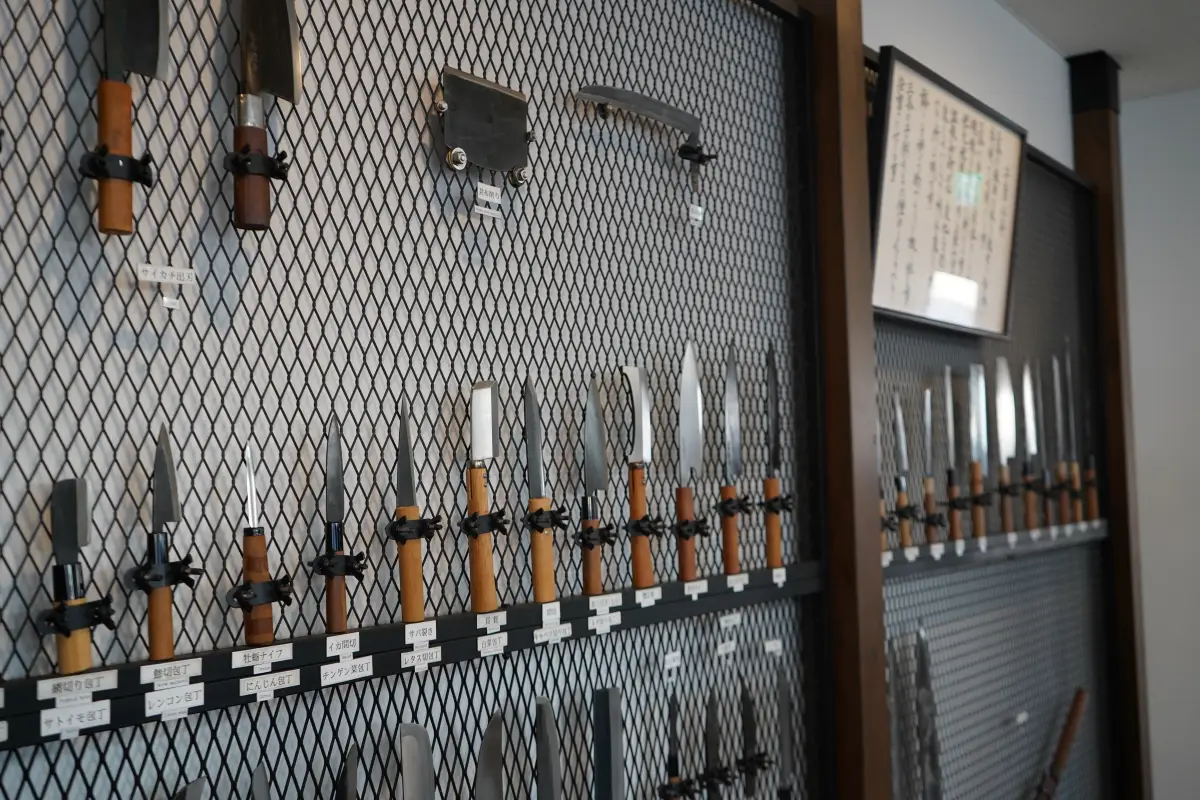 壁には漁師など専門職が使うような珍しい包丁がズラリ