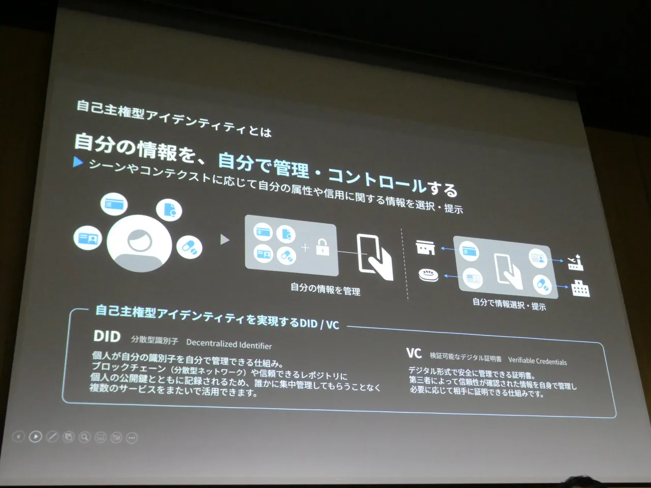 この世界観を実装する要素として議論されたのが、DID(分散型識別子)とVC(検証可能なデジタル証明書)である。樋口さんは、自己主権型を実現する仕組みとしてDID/VCを挙げ、個人が情報を管理し、場面に応じて提示する姿を示した。