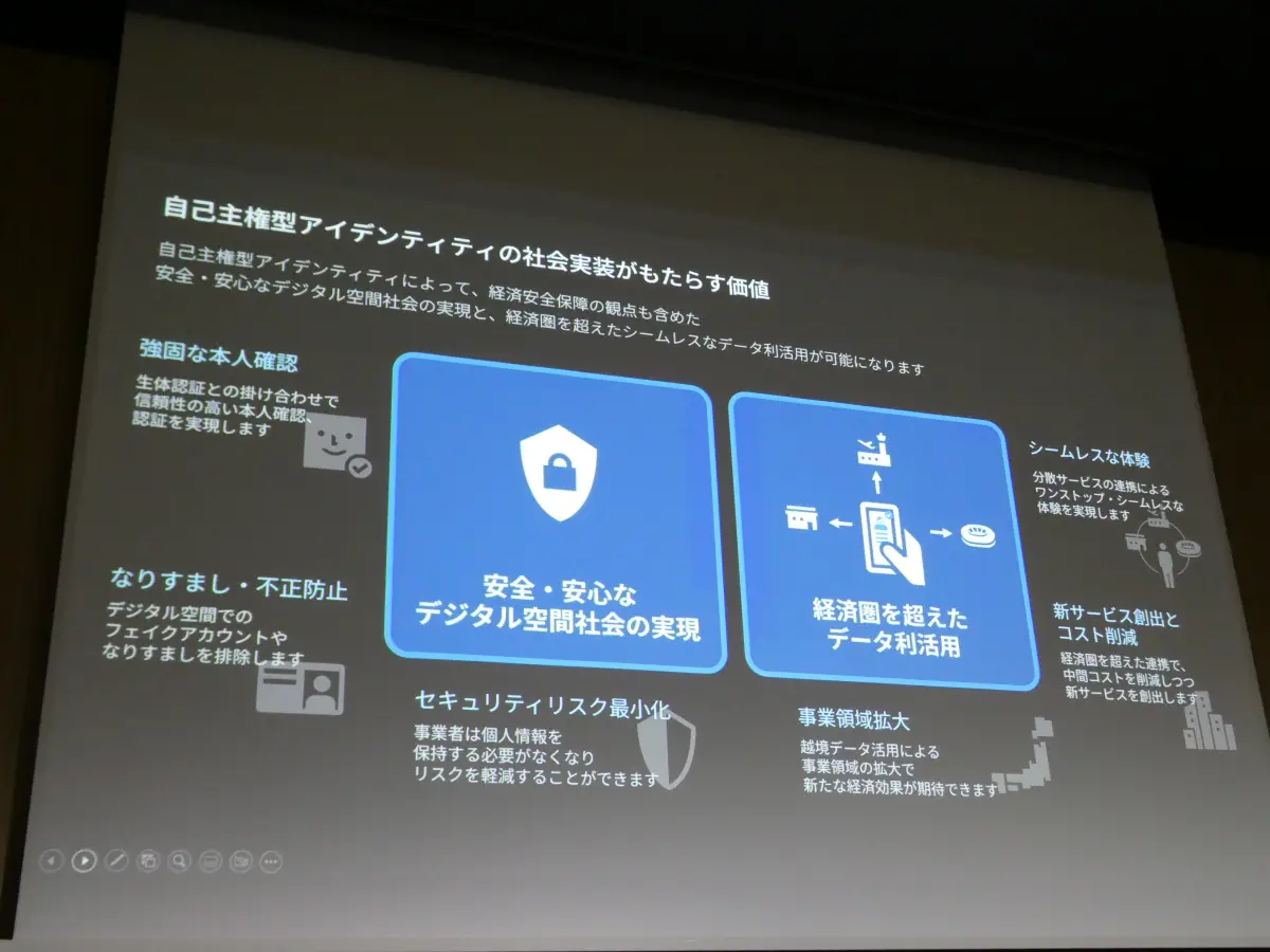 ここで重要なのは、自己主権型が『管理を拒む思想』ではない点だ。誰もが好き勝手に名乗る世界ではなく、検証可能性(第三者が確かめられること)とプライバシー(出し過ぎないこと)を同時に成立させる。セッションでは、自己主権型が「認証技術の進化」に留まらず、データの流通設計そのものを変える可能性が語られた。個人がデータを保持できれば、企業は不要な個人情報を抱え込む必要が減る。本人確認が強固になれば、なりすましや不正のコストも下げられる。