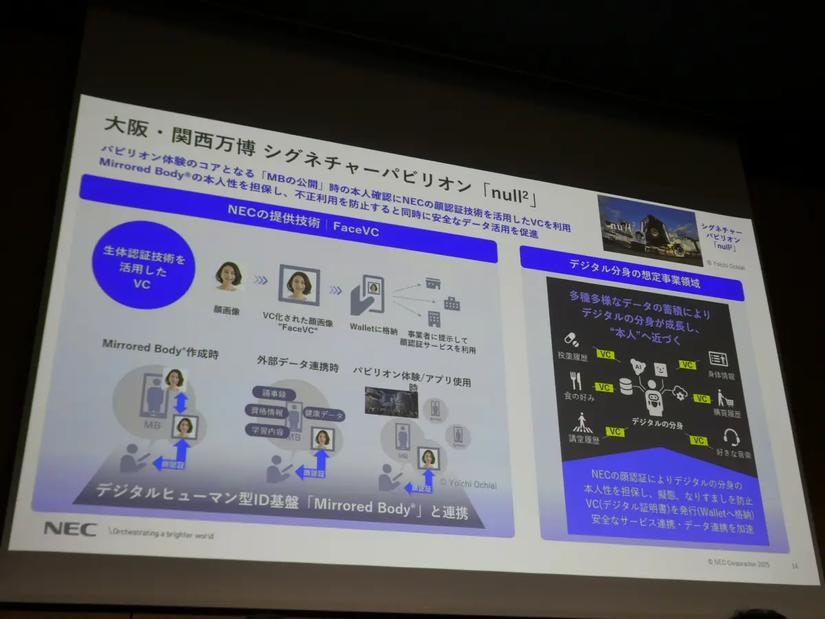 日本電気株式会社(NEC) バイオメトリクス・ビジョンAI統括部 Decentralized ID事業開発グループ プロフェッショナル 関根宏さんは、大阪・関西万博のシグネチャーパビリオンでの「Mirrored Body®」との連携を紹介し、NECの生体認証とVCを組み合わせた「FaceVC」を説明した。顔写真をVCとして持ち、顔認証で自分であることを証明したいときに提示できる仕組みだという。