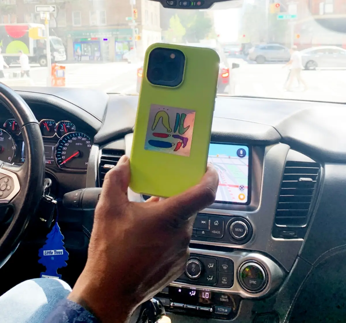 ニューヨークで偶然乗ったタクシーの運転手が過去にヘルニアで悩んでいたと聞き、ステッカーを渡したところ、面白がって受け取ってくれました。
