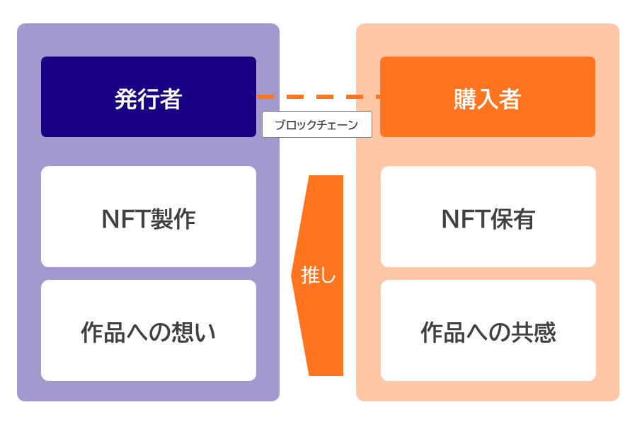 NFTとは、クリエイターとエンドユーザーの関係をブロックチェーンに刻む仕組みです。誰が作ったか。誰が受け取ったか。それが消えない記録として残る。これは単なる技術の話ではなく、「あなたの作品を、私は確かに受け取った」という意思表示が、永続的な形を持つということです。