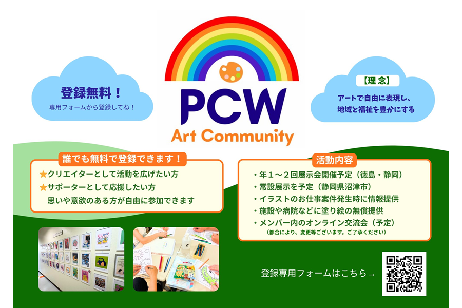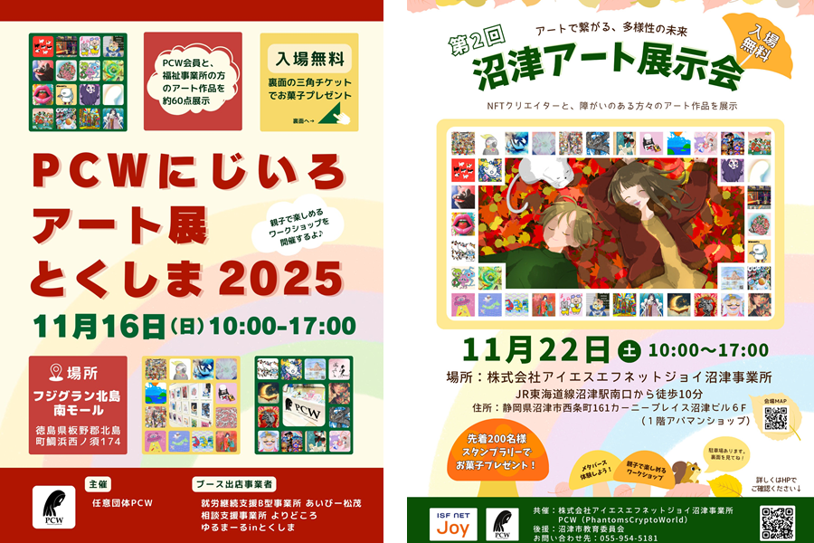 徳島県を拠点に活動するPCWアートコミュニティは、その好例です。代表の中山知保さんは、NFTアートの制作をきっかけに地域とアートをつなぐコミュニティを立ち上げ、障がいのある方がイベント運営に参加する仕組みや、クリエイターの塗り絵素材を福祉施設へ届ける活動へと広げてきました。