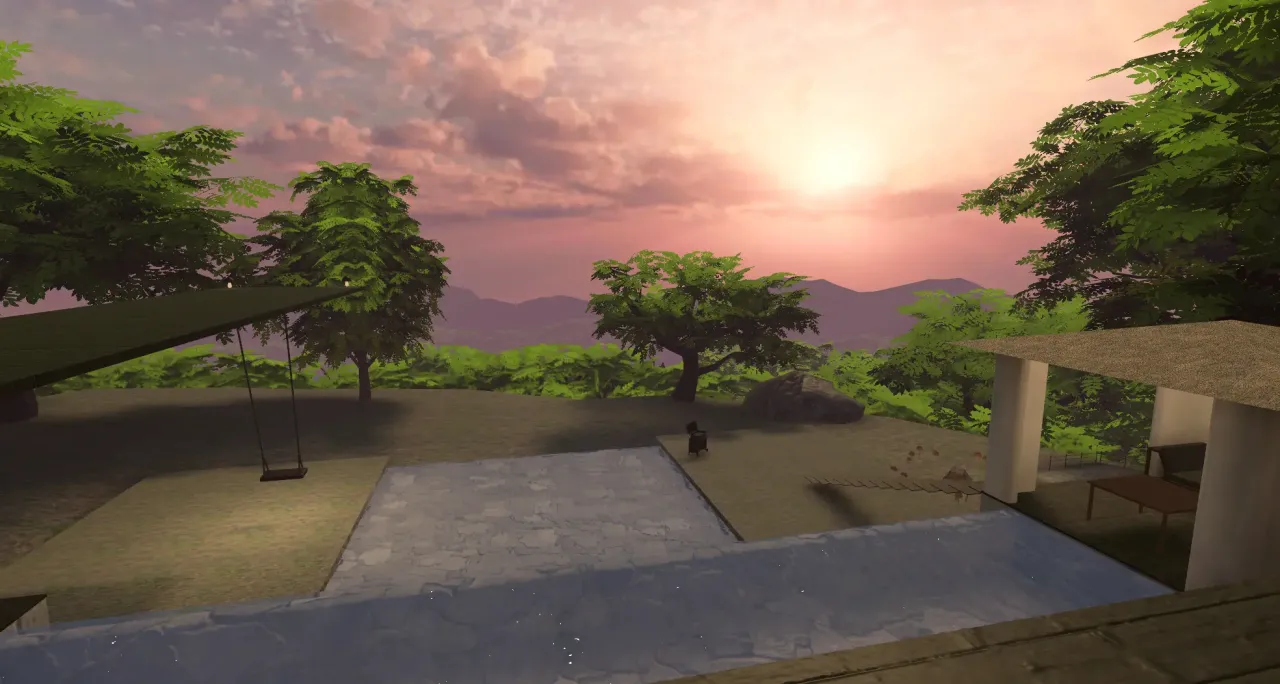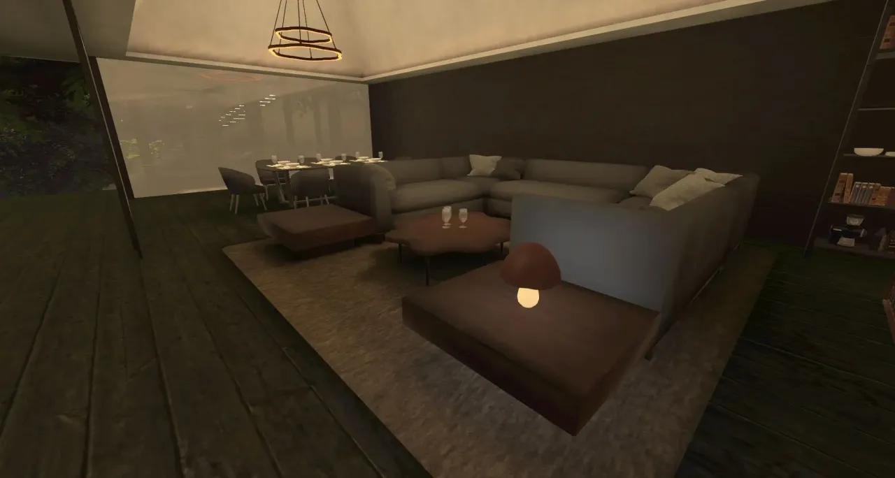 時間帯は「夕方のマジックアワー」に固定されており、一日の終わりに向かう温かな空気感を演出するために、光源やライティングが何度も調整されたという。きのこ型のランプが柔らかく光るのも、この時間帯だからこそ映える。